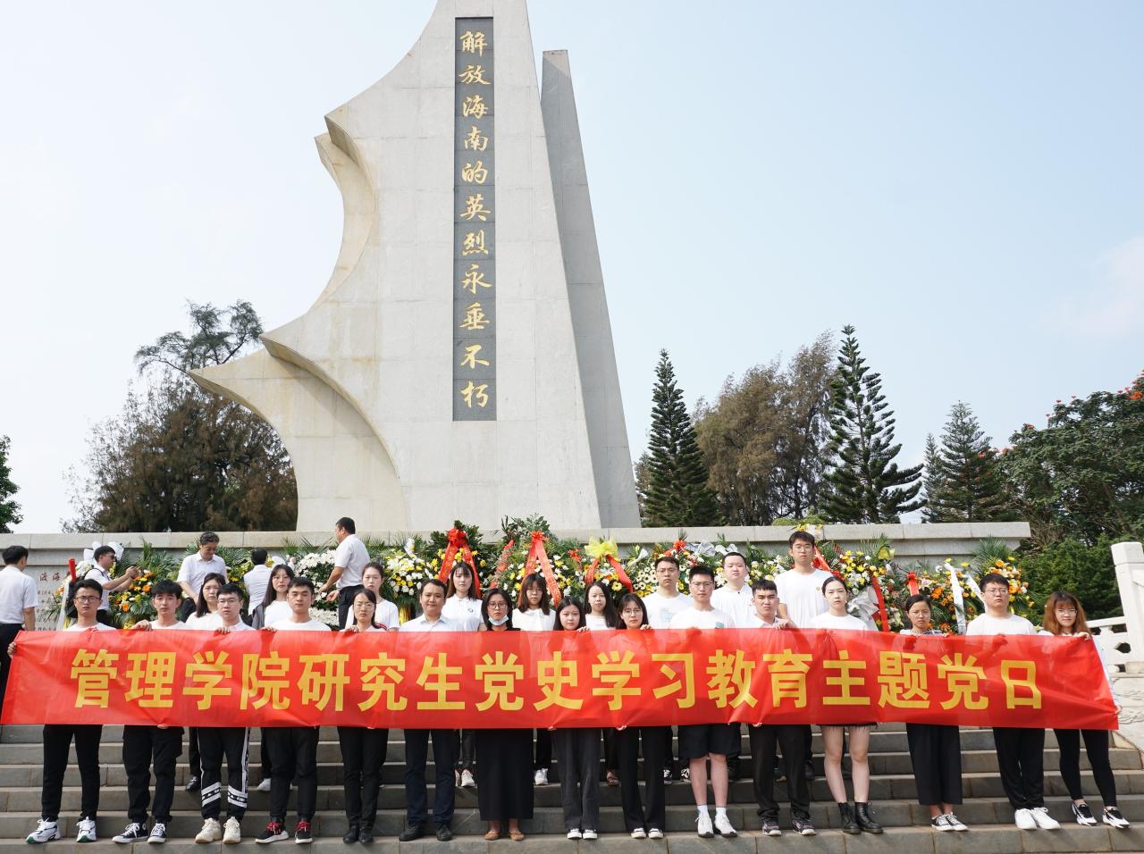 4月4日上午,管理公司工商管理研究生党支部、会计研究生党支部、农林经济管理研究生党支部在海口市金牛岭烈士陵园联合开展“缅怀先烈,致敬忠魂”主题党日活动。全体党员向革命烈士鞠躬默哀,并为英勇献身的革命烈士敬献鲜花。随后,几位党员同志带领同学们回顾了中国共产党艰苦卓绝的发展史,理解习近平新时代中国特色社会主义思想的传承,提醒同学们在珍惜新时代美好生活的同时也要牢记幸福是奋斗出来的,勉励同学们勤奋学习,不负韶华,做一名无愧于新时代的青年党员。