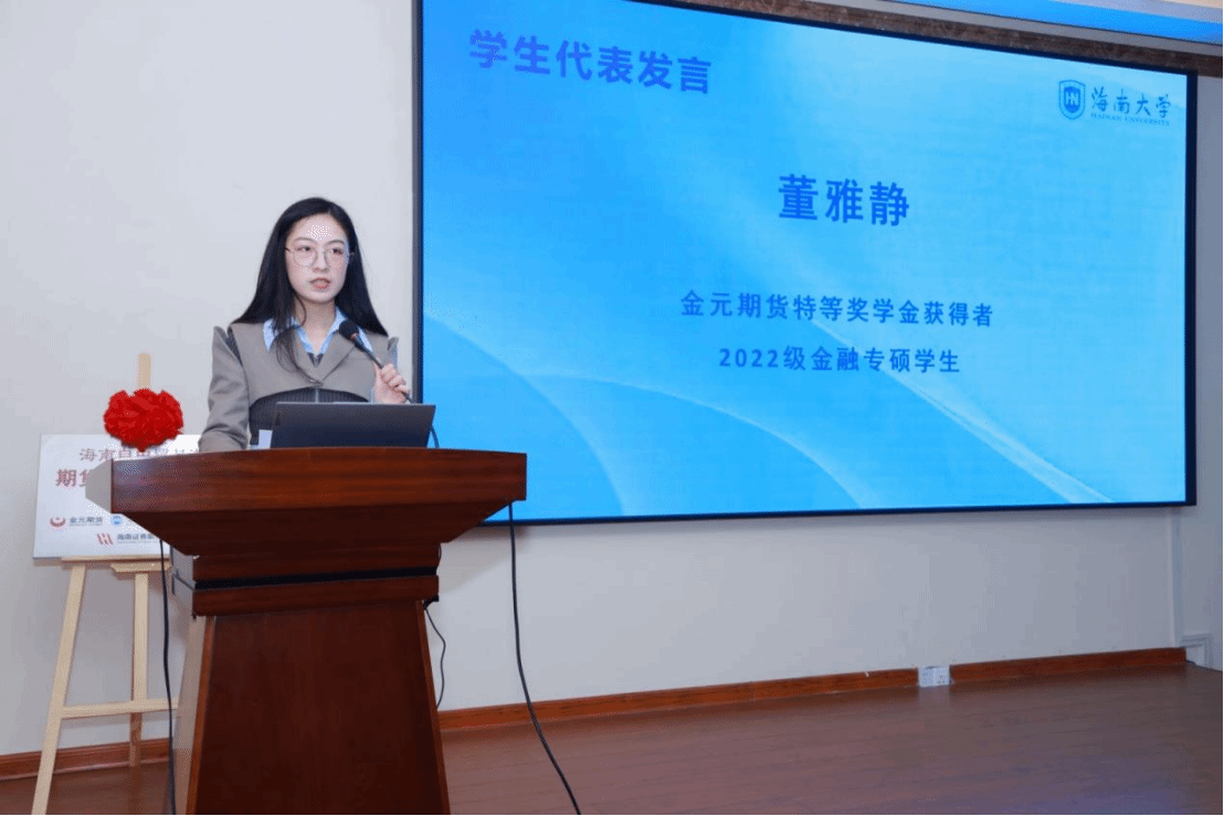 员工代表董雅静发言中表示通过参与海南自贸港期货人才培养基地项目第二期,深刻感受到金融领域的活力与发展空间,同学们能够更加贴近市场的脉搏去感受国际化背景下金融市场的快速变化,在此基础上更深入地了解期货市场的运作机制、行业动态以及风险管理策略,这为同学们将来投身社会实践打下了扎实的基础,也为同学们日后择业就业积累了宝贵的经验。