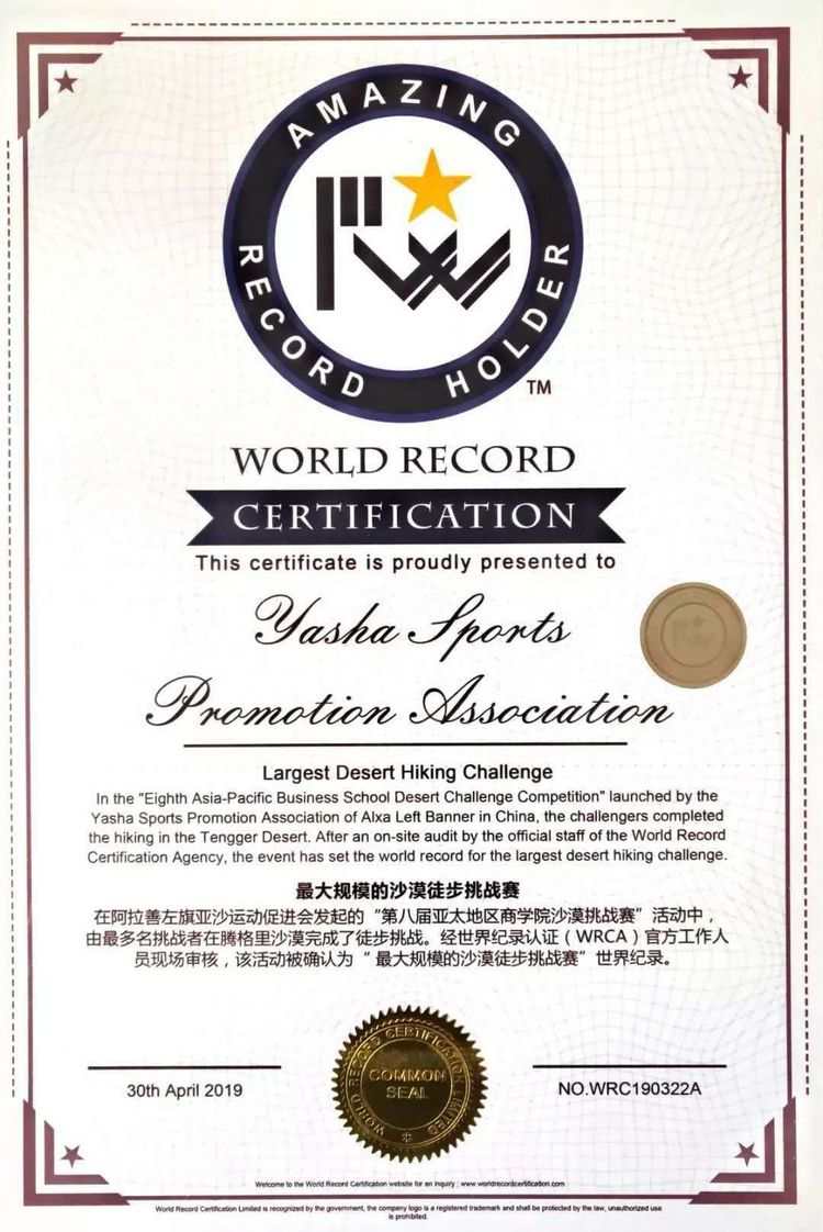 第八届亚太地区商公司沙漠挑战赛(简称沙8)共有来自中国大陆、台湾、香港、澳门、英国、澳大利亚等国家和地区的109所商公司的近3000名MBA学子参赛并完成了徒步挑战。以实际行动践行“环保、协作、坚持、责任”的赛事理念,挑战自我、超越极限实现与强者同行,成就团队和自我的目标。经世界纪录认证(WRCA)官方工作人员现场审核,该活动被确认为是“最大规模的沙漠徒步挑战赛“世界纪录,所有参赛队员将被纪录在这历史的一页。