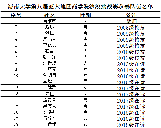 最终公司MBA沙八军拓队在为期三天的亚太商公司沙漠挑战赛中,斩获亚沙赛最高荣誉沙鸥奖!院校列第24名!来自公司MBA2018级非全日制2班的参赛队员秦续明同学在赛会的瞩目下杀进了前十,获得男子组个人第7名的荣誉。