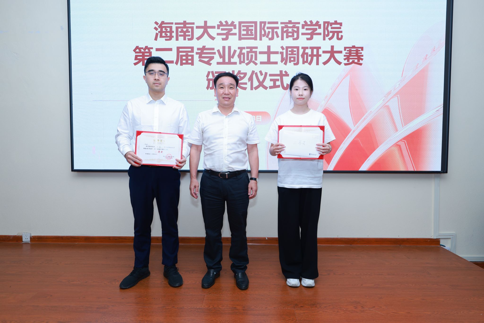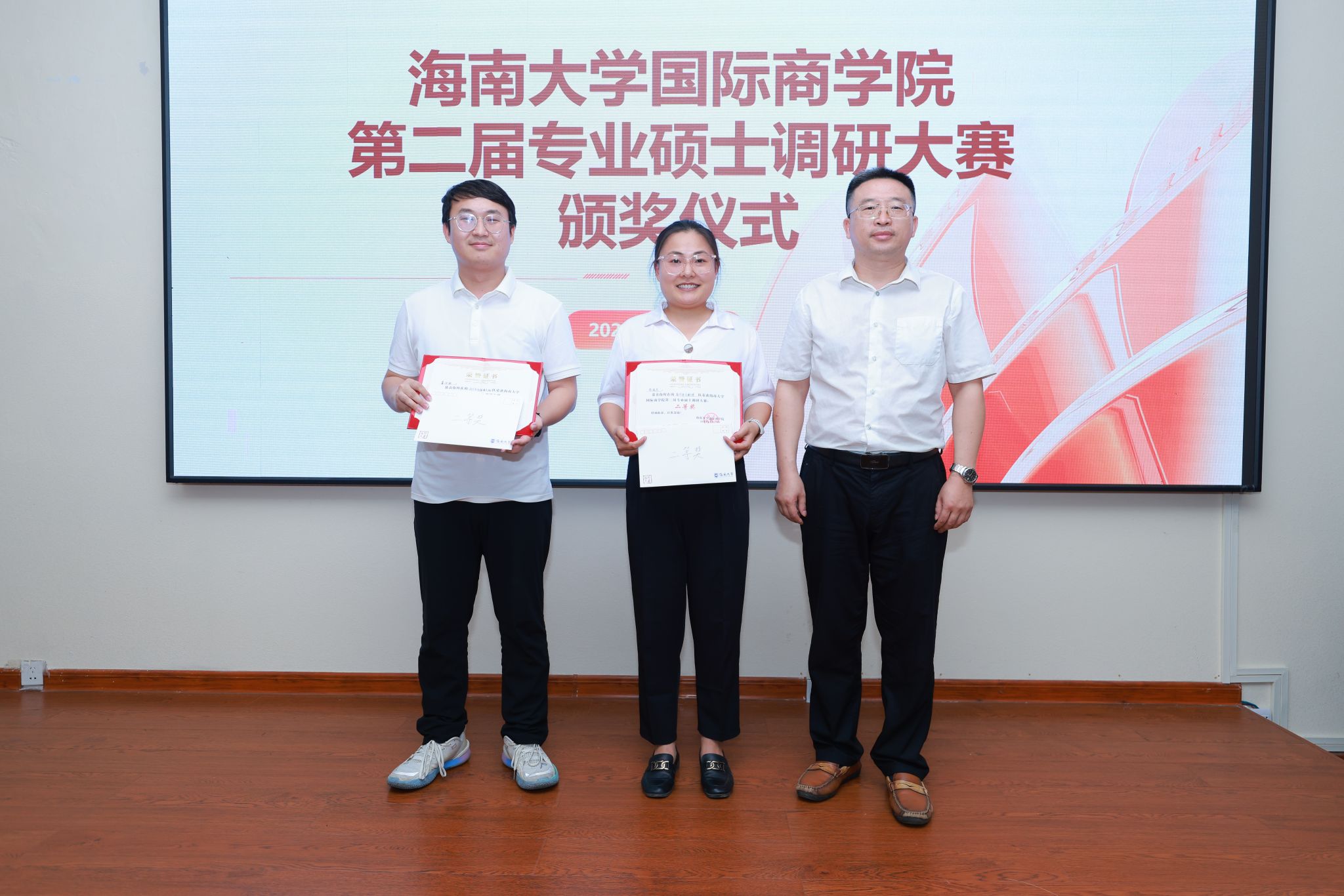 荣获二等奖的八支队伍分别为:数字语文酥饼队(MBA)、论文写在祖国大地上(MBA)、我与评委同行队(农业硕士)、椰奶清补凉队(农业硕士)、逐梦自贸港(农业硕士)、如履薄冰组(农业硕士)、火箭队(会计专硕)、审计会计莫与我争锋队(会计专硕)。副经理付景涛,万长华,戴扬分别为获得二等奖的参赛队伍颁奖。