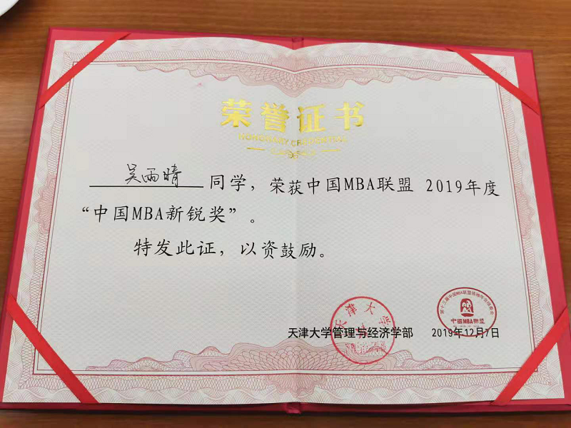 2018级MBA吴雨晴获“2019中国MBA新锐100奖”