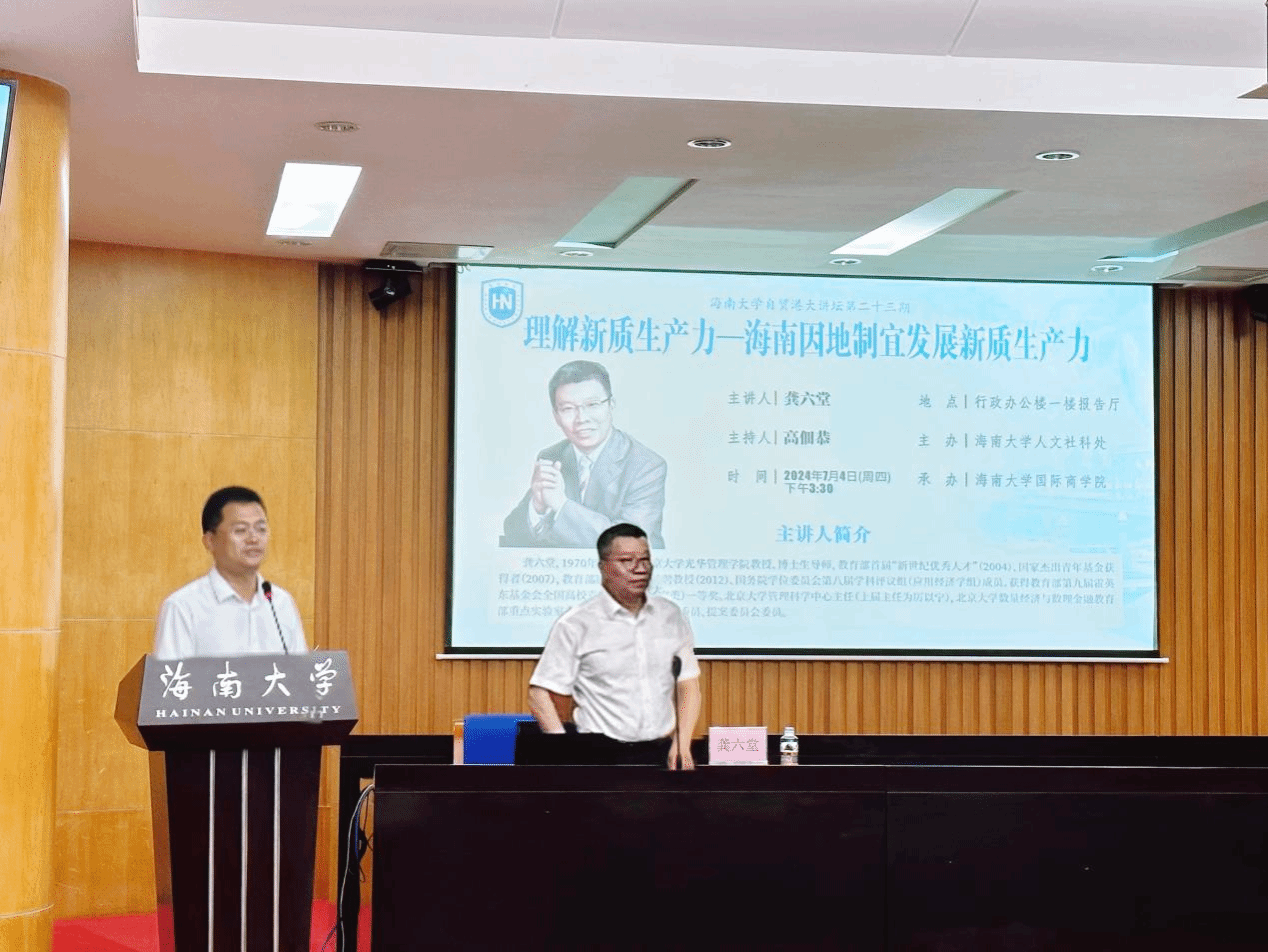 2024年7月4日下午3点30分,国务院应用经济学学科评议组成员、北京大学光华管理公司教授龚六堂以《理解新质生产力—海南因地制宜发展新质生产力》为题,为师生们解读了新质生产力的发展。本次讲座由fun88乐天使人文社科处主办,fun88乐天使承办。fun88乐天使副董事长高佃恭主持讲坛。