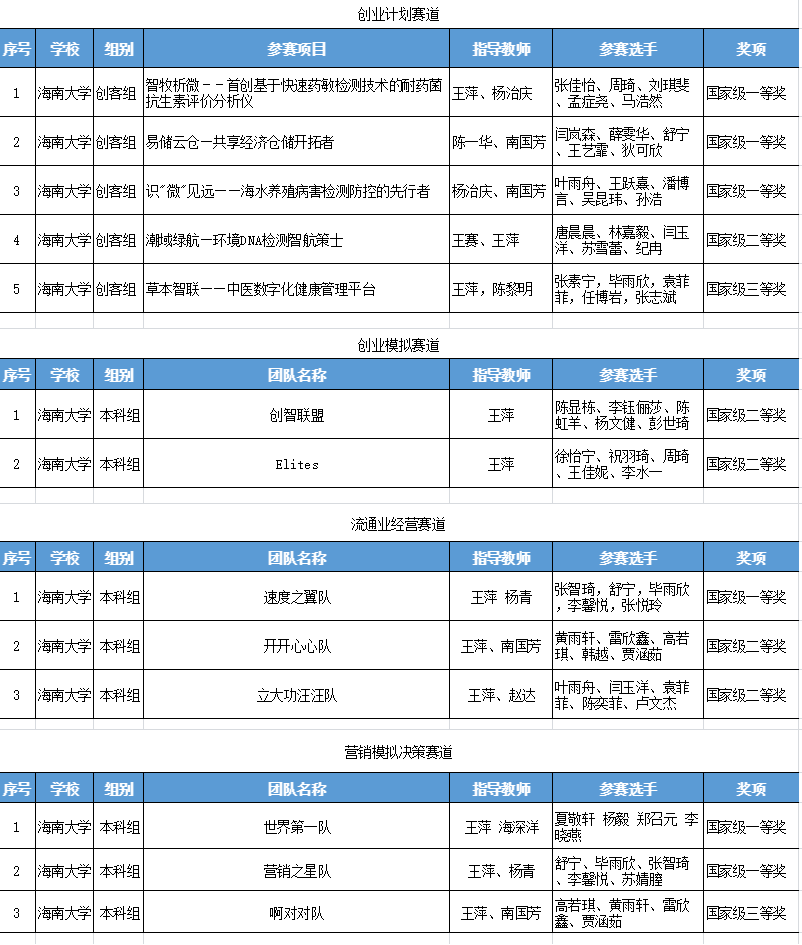 竞赛分为创业计划、创业模拟,流通业经营模拟、营销模拟决策四个赛道。在创业计划赛道,fun88乐天使获国家级一等奖3项,国家级二等奖1项,国家级三等奖1项;在创业模拟赛道,fun88乐天使获国家级二等奖2项;在流通业经营赛道,fun88乐天使获得国级一等奖1项,二等奖2项;在营销模拟决策赛道,fun88乐天使获得国家级一等奖2项,三等奖1项。