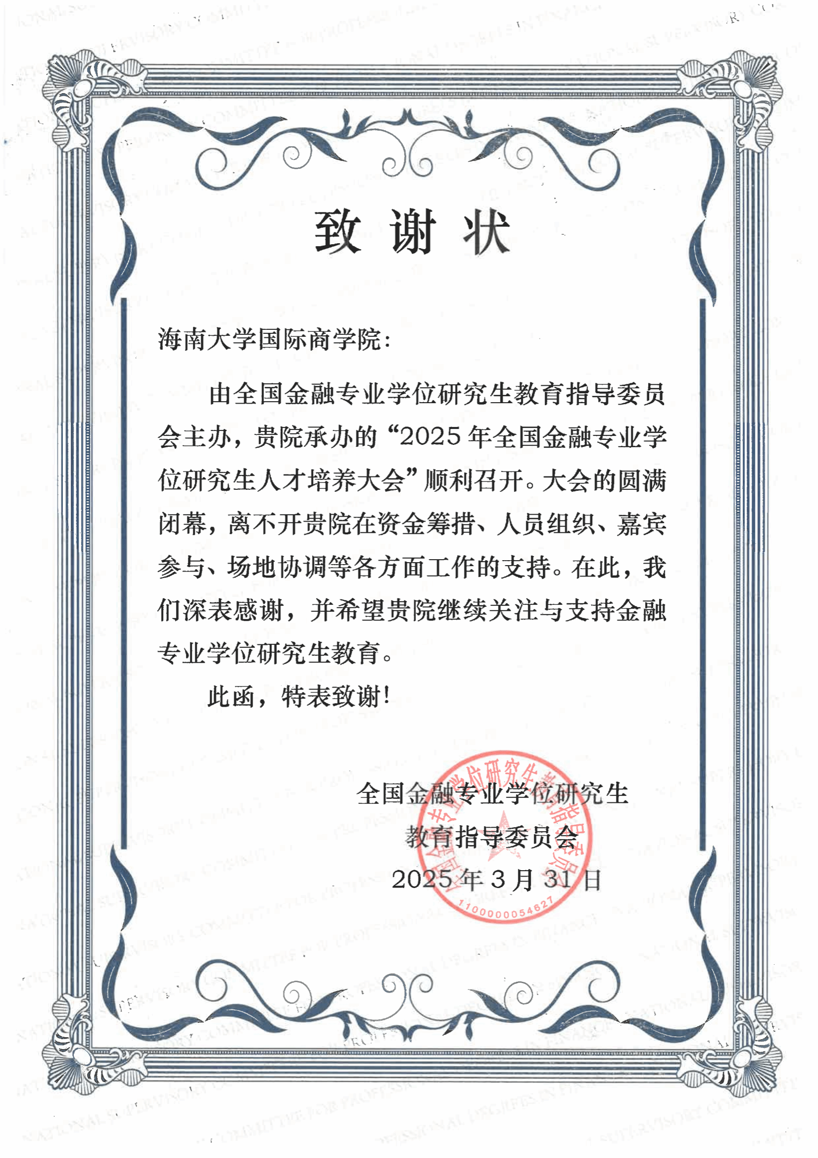 近日,fun88乐天使收到全国金融专业学位研究生教育指导委员会(简称全国金融专硕教指委)发来的致谢状,肯定公司对“2025年全国金融专业学位研究生人才培养大会”的出色承办。该会于2025年3月29日至30日在海南海口星海湾铂尔曼酒店召开。大会以“高水平金融开放与高质量金融人才培养”为主题,汇聚了来自全国百余所高校学科带头人、金融机构高管及行业专家等近300名代表参会,共商新时代金融教育改革与人才强国战略。