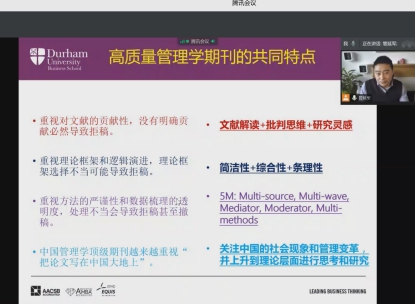 管教授作为多家国际重要学术期刊的副主编和审稿人,分享了他在学术研究、论文发表及稿件评审与回应方面的经验,向学员们介绍了学术写作的历程。首次课程,他从讲授管理学论文的写作与发表意义开始,到反思被拒稿的若干主要原因,再到获取有价值研究灵感的途径与方法,最后到学术论文写作的架构模式和撰写次序,并提出了有效应对审稿人苛刻意见的原则及方法。课程内容翔实丰富,管老师深入浅出、幽默风趣的授课风格让学员们有非常强的课程卷入感。