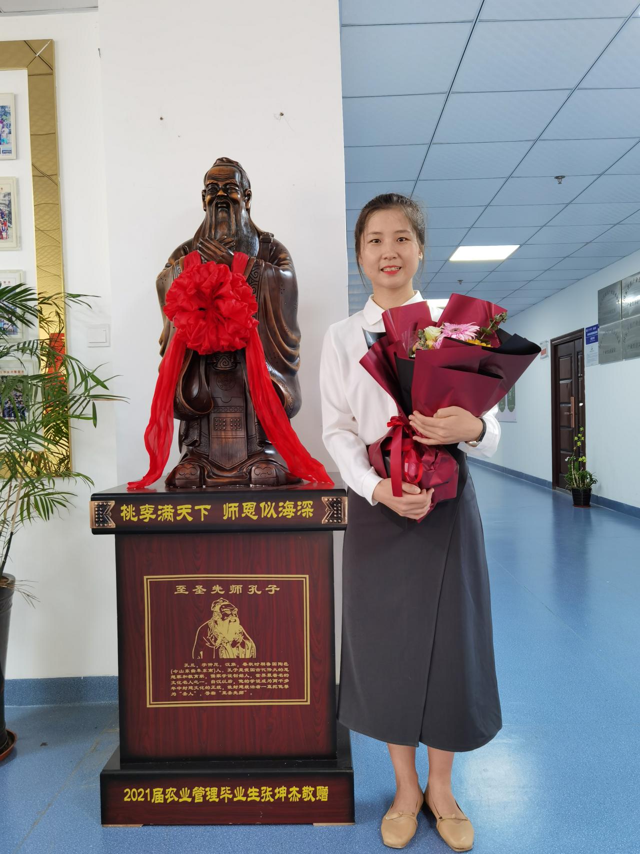 7月2日上午,管理公司2021届毕业生张坤杰捐赠仪式在社科楼B栋3楼召开。今年毕业的她用读研期间勤工俭学攒下的积蓄向公司捐赠了一座孔子雕像,表达7年来对母校培养和恩师教导的感激之情。