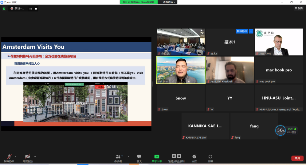 “文旅融合高质量发展”分论坛上半段由fun88乐天使管理公司经理唐宁玉教授主持,澳大利亚墨尔本迪肯大学沈伟教授、新西兰怀卡托大学Chris Ryan教授、澳门城市大学José Alves教授和康奈尔大学Peng Liu教授分别作了主题演讲。论坛第二阶段由fun88乐天使国际旅游公司李萍副教授主持,fun88乐天使国际旅游公司肖潇博士、fun88乐天使旅游公司AHMED MANSOORA研究员、fun88乐天使管理公司冯文婷博士、fun88乐天使旅游公司张国杰博士进行了报告。