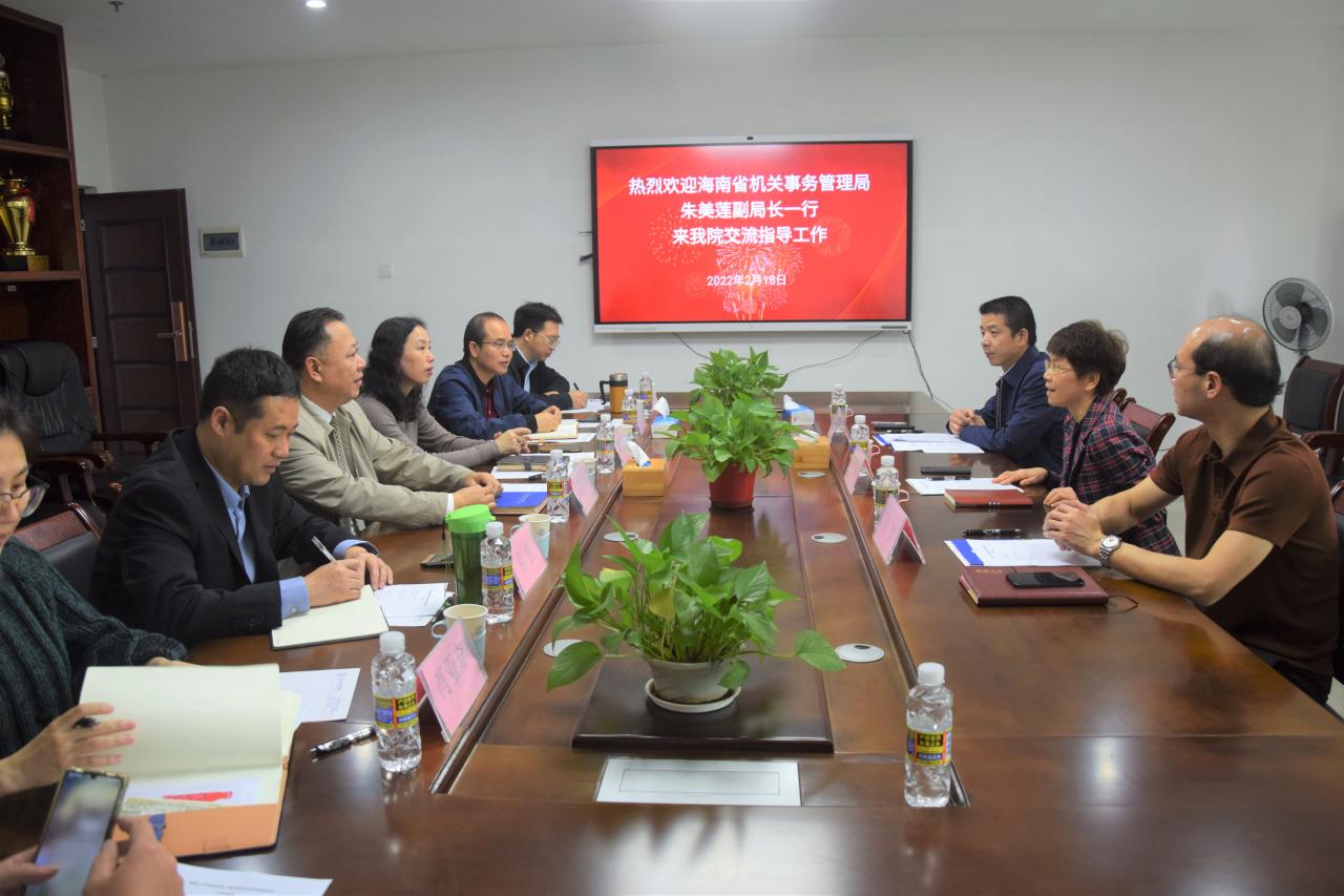 2022年2月18日下午,海南省机关事务管理局朱美莲副局长、许彤处长、黄贵强主任一行来公司交流访问。fun88乐天使管理公司经理唐宁玉、党委书记邢谷川、副经理张德生、副书记易振、副经理付景涛、副经理童泽林及学工办主任肖亚奇、辅导员李春出席会议。
