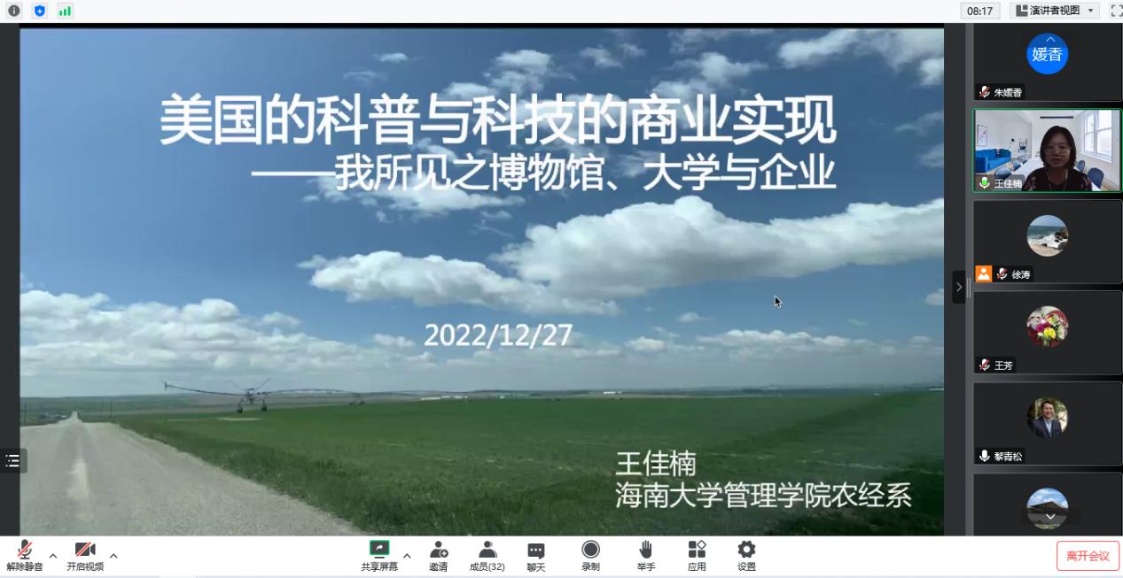 12月27日下午,尖峰热带农经驿站第1期邀请到管理公司农经系王佳楠副教授作了主题为《美国的科普与科技的商业实现——我所见之博物馆、大学与企业》的访学报告。报告会由农经系副系主任徐涛主持,公司师生30余人聆听了此次报告。