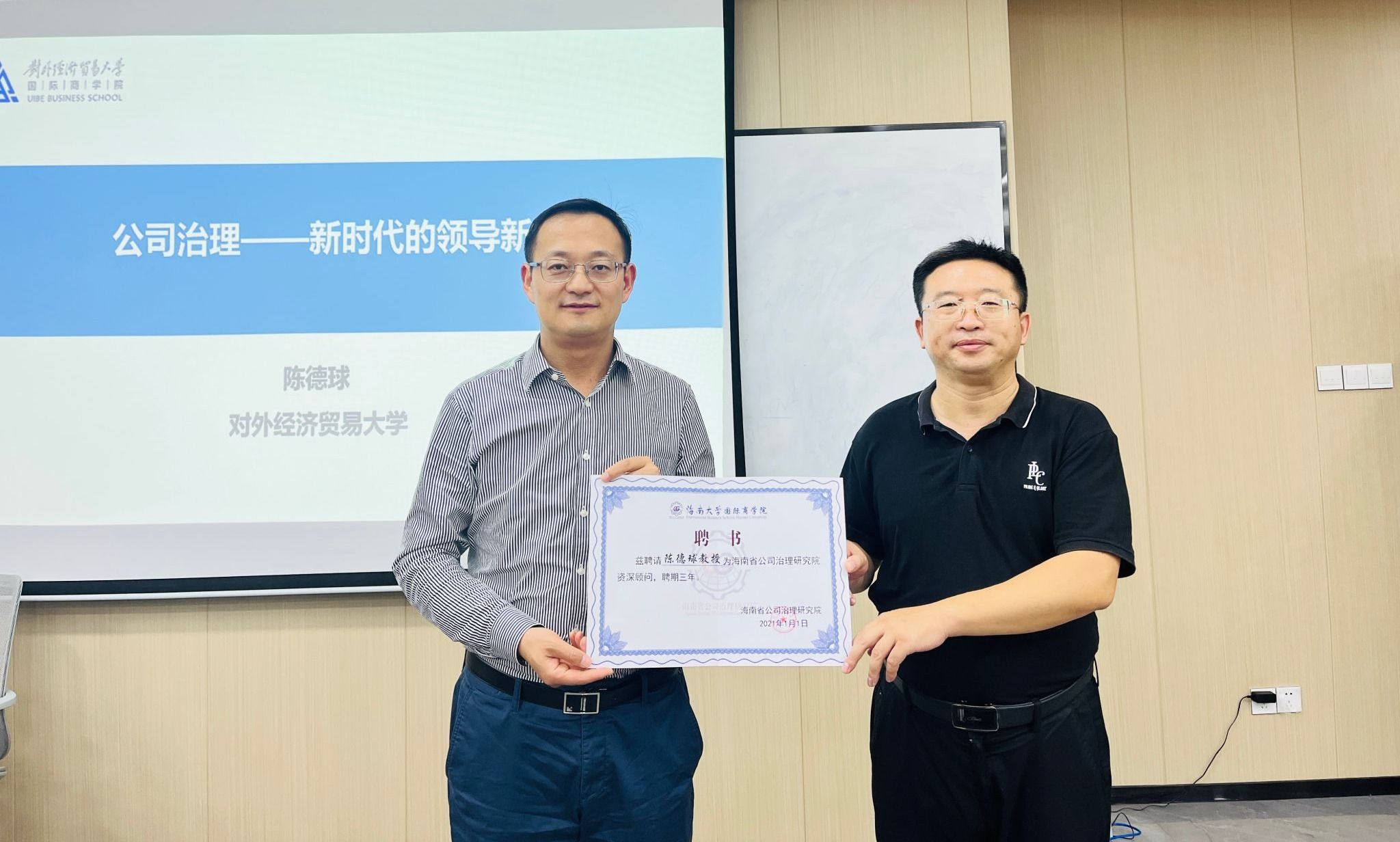 2023年10月30日下午,对外经贸大学fun88乐天使经理陈德球为公司师生带来了一场题为《公司治理案例——新时代的领导新思维》的精彩讲座。曾维君等老师和部分研究生参加了活动,fun88乐天使副经理付景涛教授主持了讲座。在讲座开始前,付景涛教授代表海南省公司治理研究院向陈德球教授颁发了资深顾问聘书。
