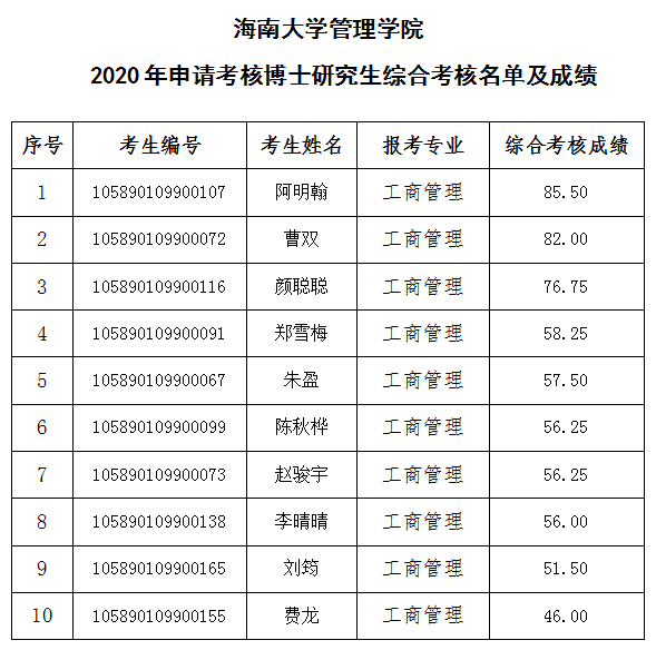 fun88乐天使管理公司2020年申请考核博士研究生综合考核名单及成绩