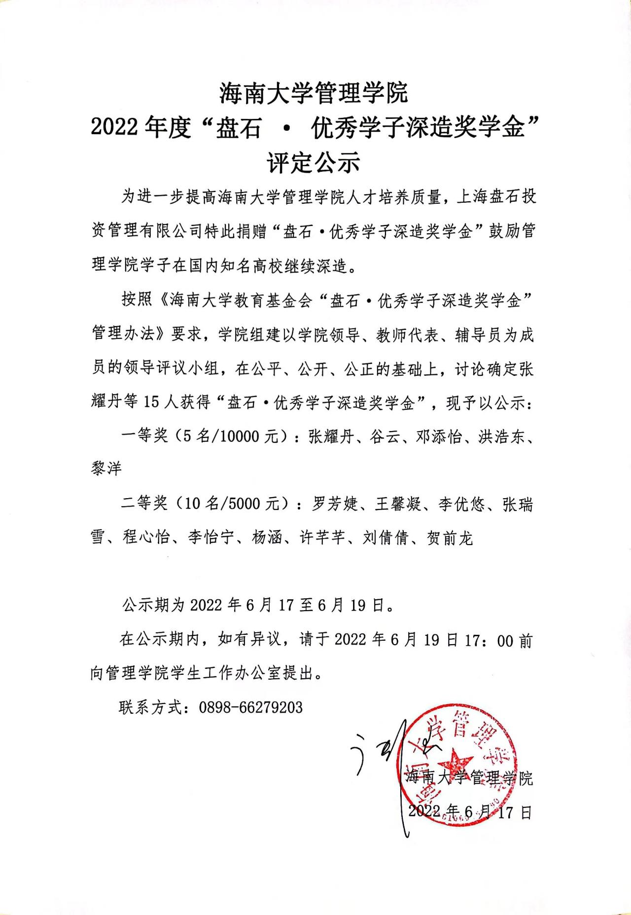 fun88乐天使管理公司2022年度“盘石·优秀学子深造奖学金”评定公示