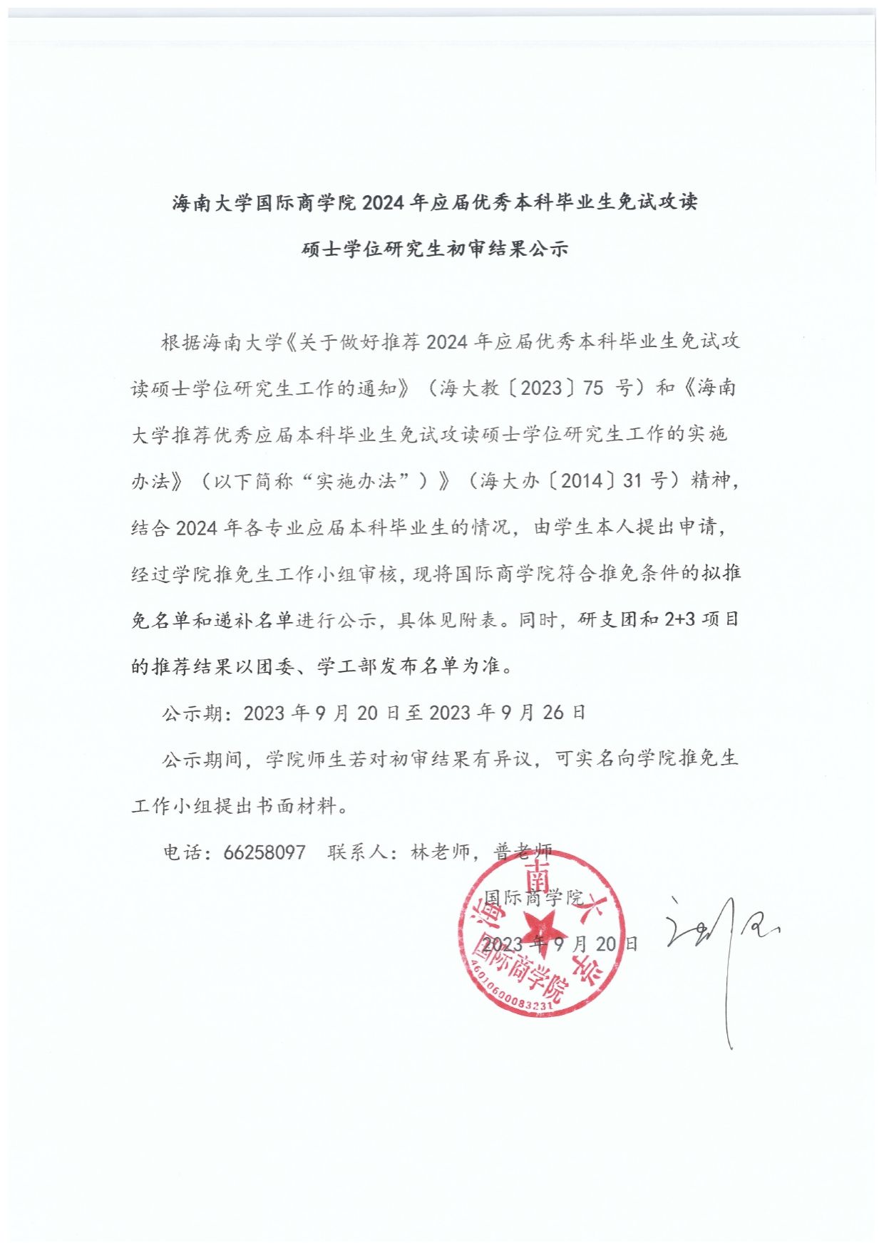 2024年应届优秀本科毕业生免试攻读硕士学位研究生初审结果公示
