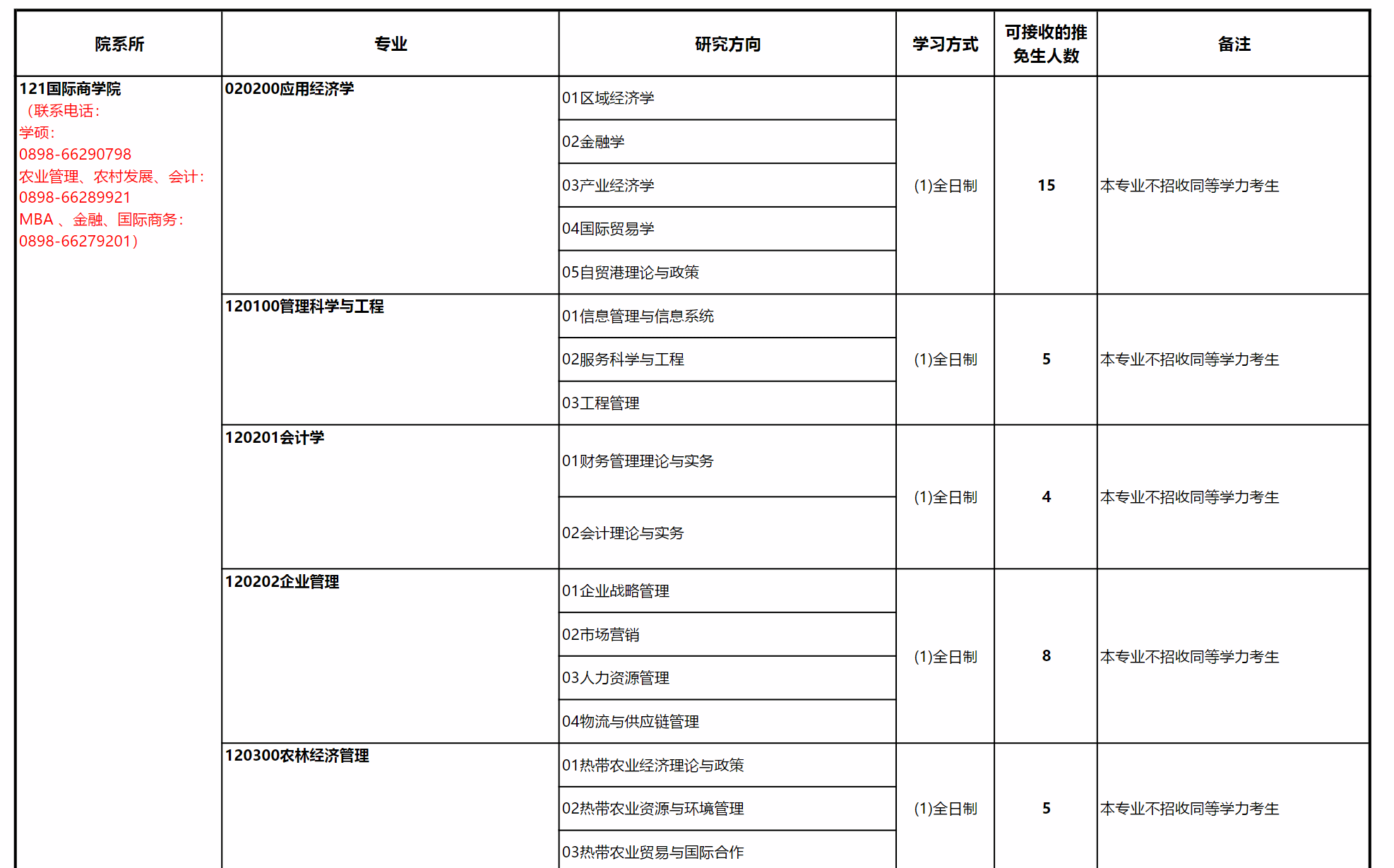(1)农业管理、农村发展、会计专硕(MPACC)联系电话:0898-66289921 联系人:黄老师、陈老师