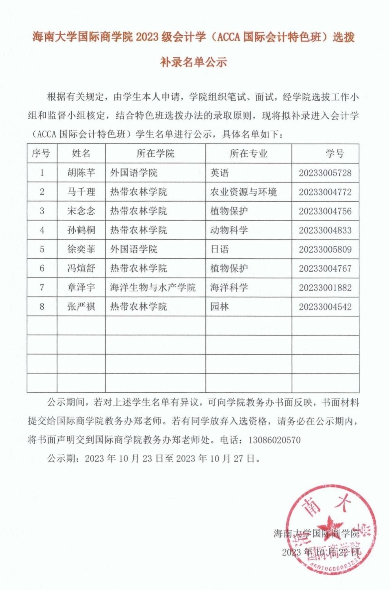 2023级会计学(ACCA国际会计特色班)选拔补录名单公示