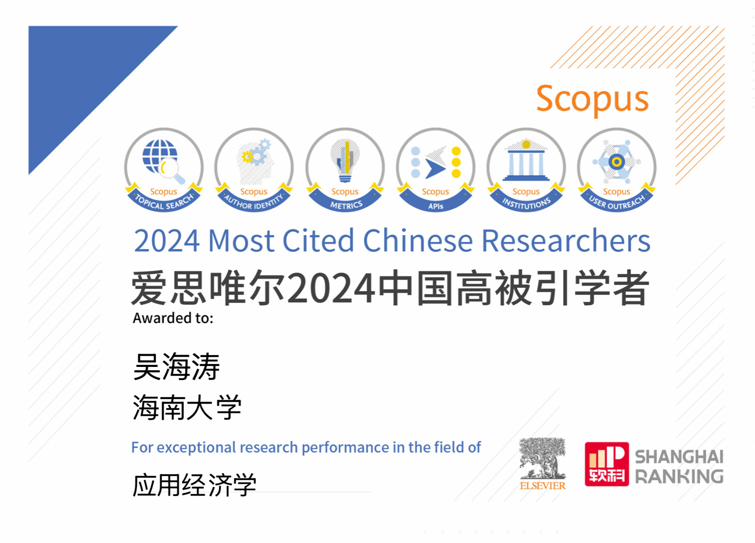 近日,爱思唯尔(Elsevier) 正式发布了2024“中国高被引学者” (Highly Cited Chinese Researchers)榜单。本次上榜共计6388人, 来自547所高校、企业及科研机构,覆盖了10个教育部学科领域中的83门一级学科。公司教师吴海涛、Jahanger Atif(阿提夫)入选“中国高被引学者” 应用经济学学科榜单,彰显fun88乐天使科研实力与学术影响力的持续提升,实现fun88乐天使团队建设和高水平人才队伍建设的新突破。