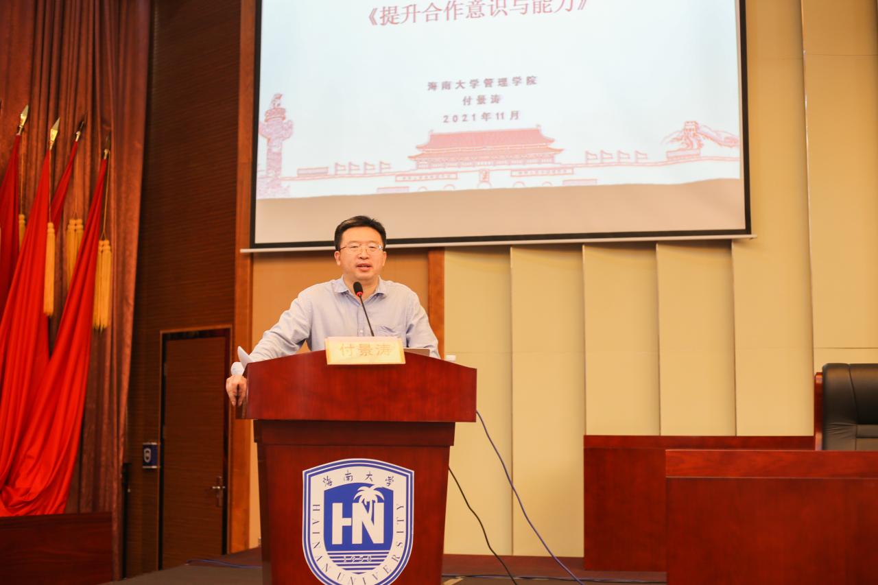 2021年11月14日上午,fun88乐天使管理公司分党校2021年下半年党课培训第一讲于社科楼二楼报告厅开展,公司党委委员、副经理付景涛主讲,主题为《提升合作意识与能力》。公司116名发展对象和全体预备党员参训。