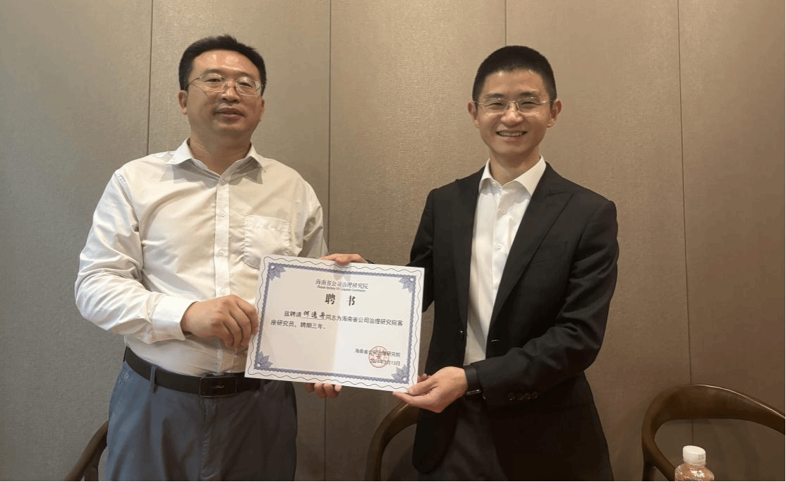 付景涛教授代表海南省公司治理研究院对何逸舟先生的到来表示热烈欢迎,并简要介绍了获得“逸舟组织管理研究基金”资助的青年科研人员代表和他们的研究取得的进展。随后,付景涛教授为何逸舟先生颁发了聘书。