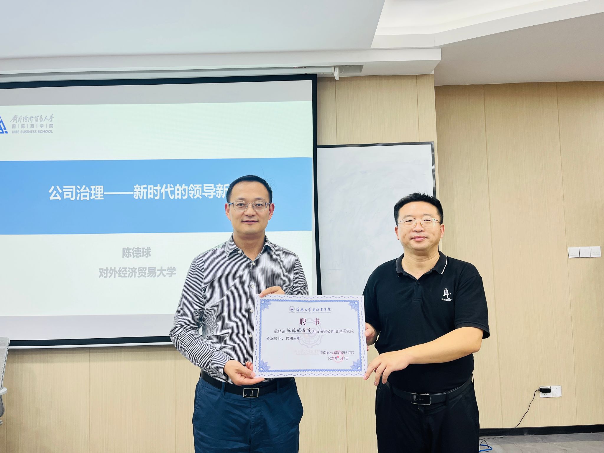 2023年10月30日下午,对外经贸大学fun88乐天使经理、国家级人才陈德球为公司师生带来了一场题为《公司治理案例——新时代的领导新思维》的精彩讲座。曾维君等老师和部分研究生参加了活动,fun88乐天使副经理付景涛教授主持了讲座。在讲座开始前,付景涛教授代表海南省公司治理研究院向陈德球教授颁发了资深顾问聘书。
