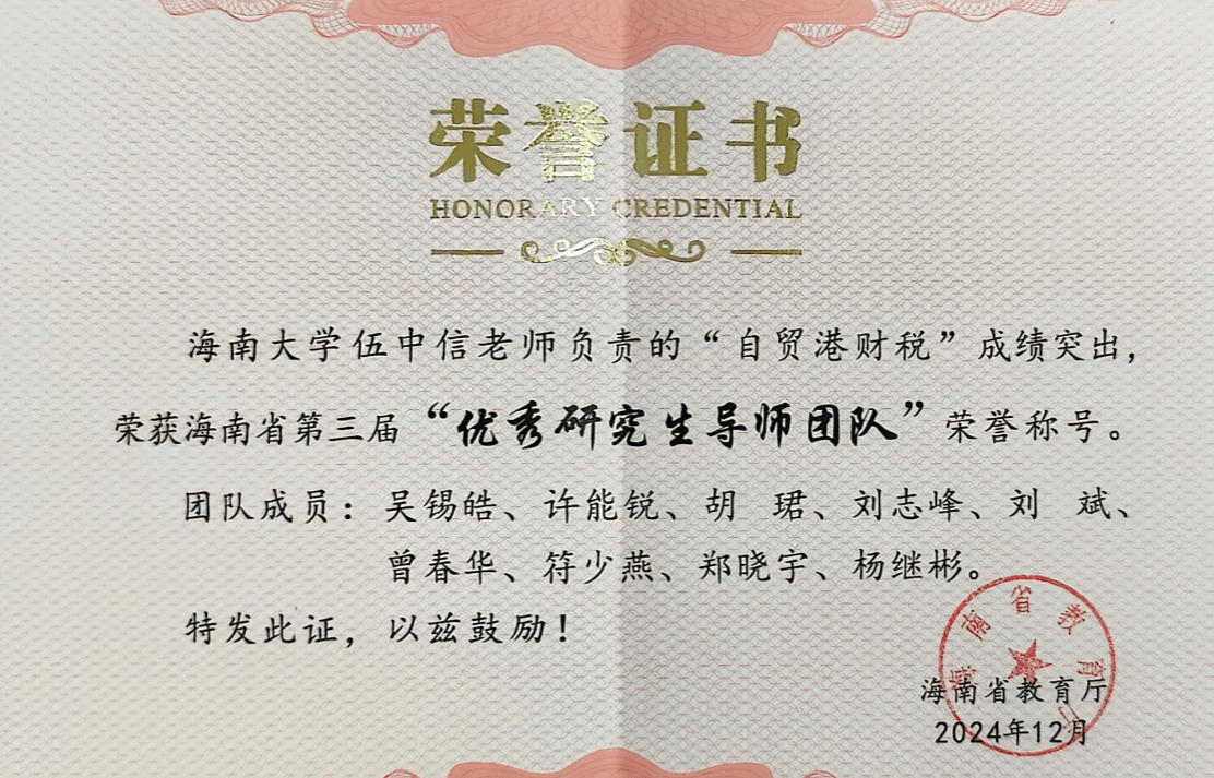 近日获悉,fun88乐天使伍中信教授带领的“自贸港财税”研究团队在海南省教育厅举办的第三届“优秀研究生导师团队”评选中脱颖而出,荣获“优秀研究生导师团队”荣誉称号。这一荣誉不仅是对团队学术成果的高度认可,也是对fun88乐天使在自贸港财税领域研究实力的充分肯定。